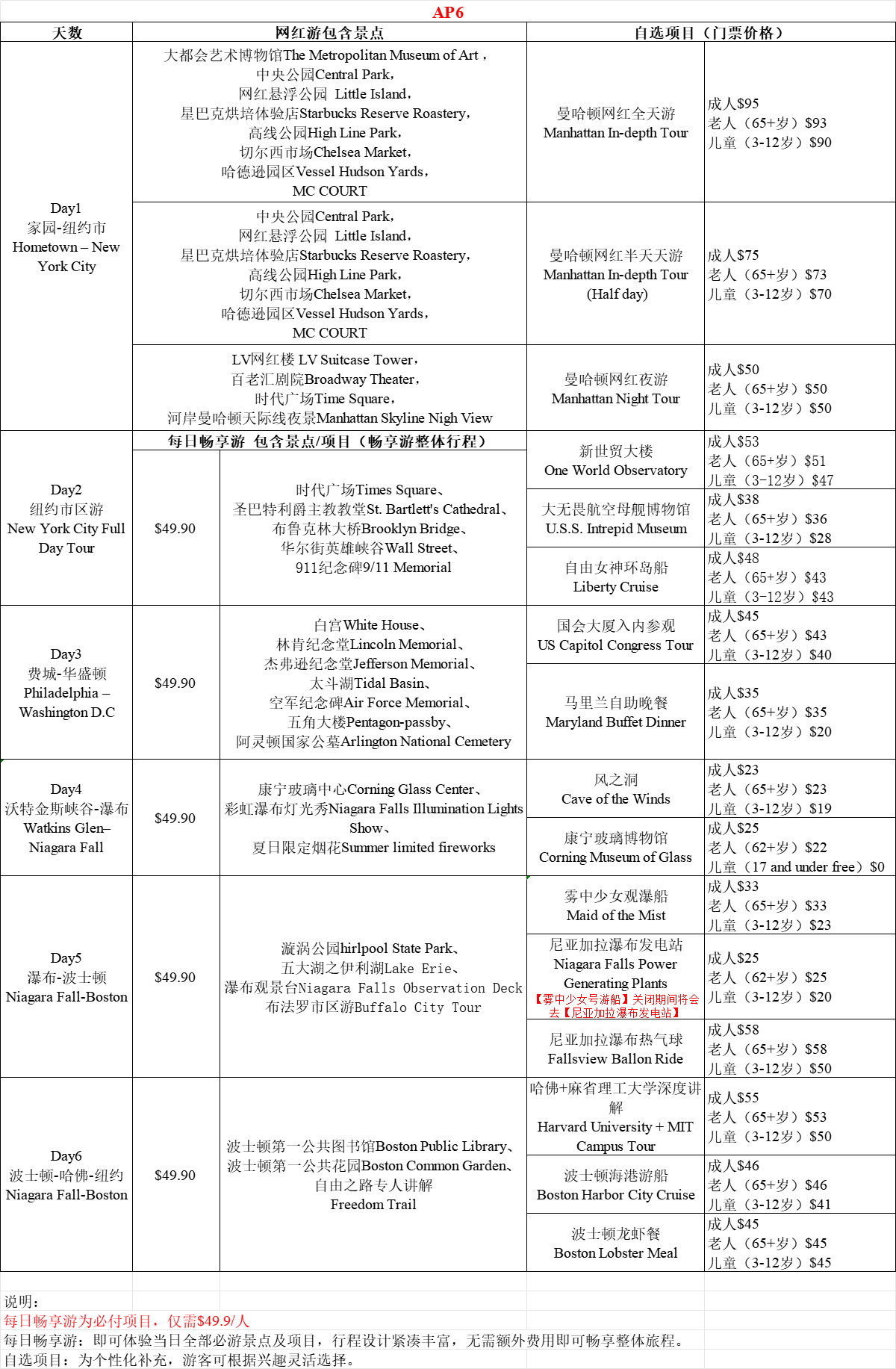 *最后一天是波士顿-纽约,送机:波士顿机场 BOS,请选择1:30 PM后航班;纽约机场JFK/LGA/EWR请选择8PM后航班,法拉盛和曼哈顿也可以离团。