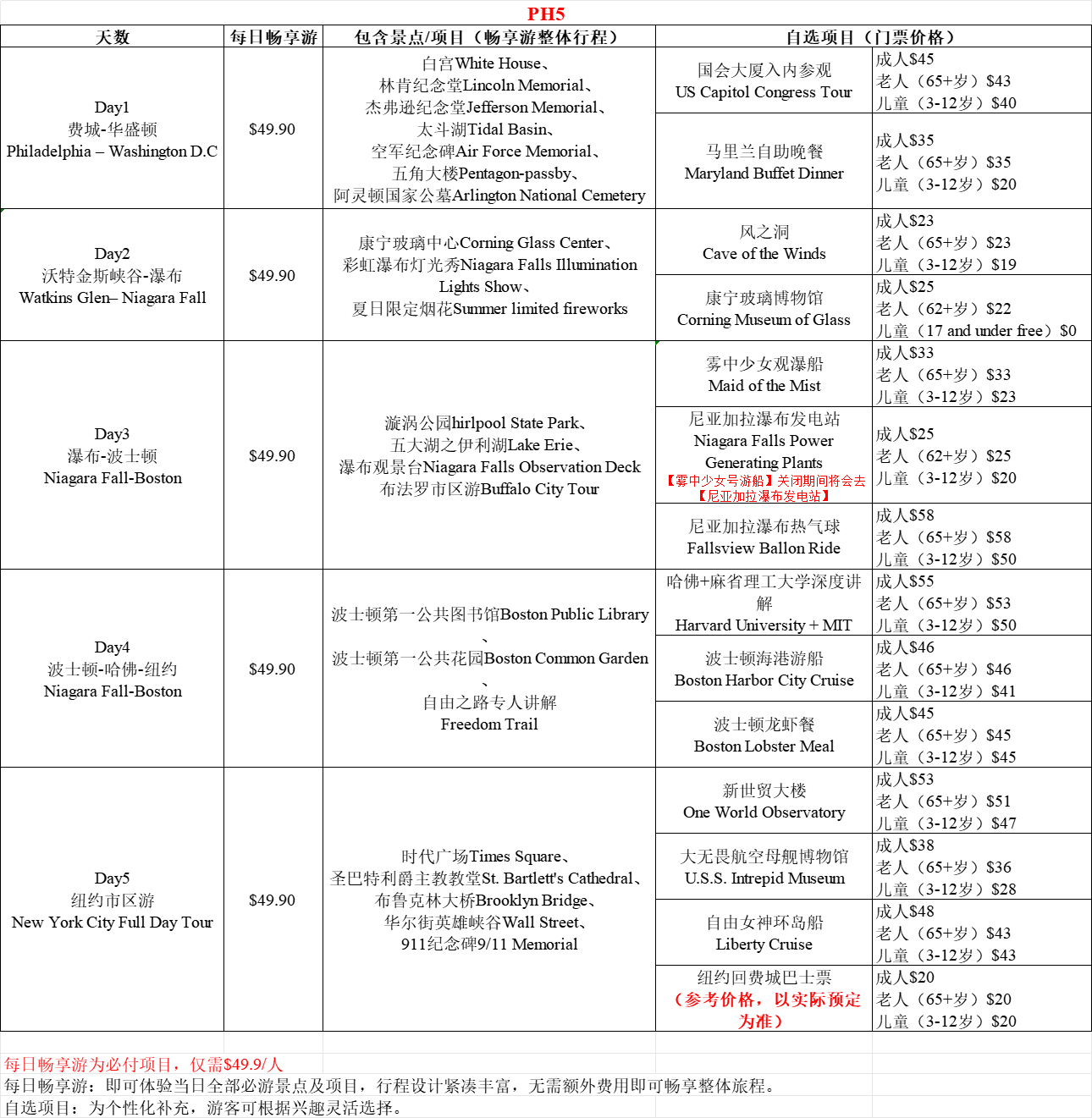 *** 不含回程费城车票,客人需自行购买,导游可协助客人, 客人可在时代广场的巴士总站Port Authority Bus Terminal下车。