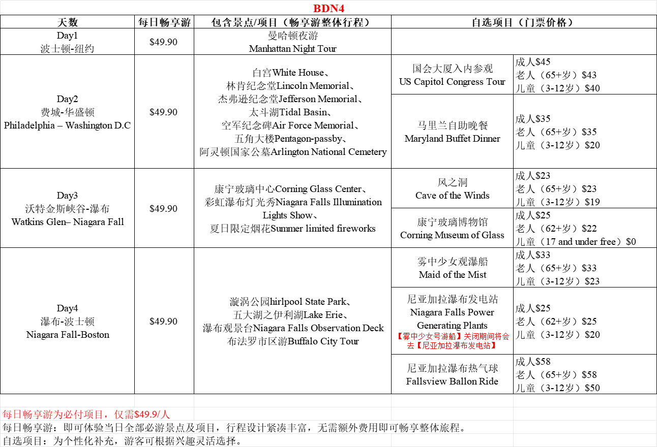 注:如10人以下需自行乘巴士前往纽约(提供车票),导游将在纽约车站接站,期间无导游陪同。乘车点:711 Atlantic Ave, Boston, MA 02111 (Dunkin Donuts)