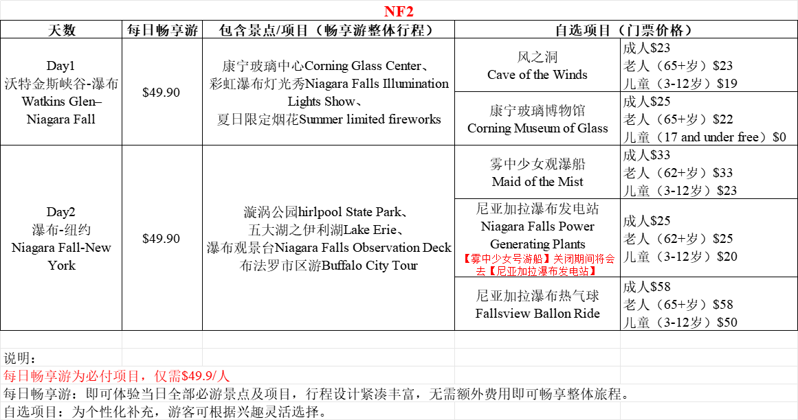 - 如遇景点临时关闭或节假日(感恩节、圣诞节、新年)关闭等,导致无法参观,导游会根据实际情况调整为外观或以其他景点代替以确保行程的丰富性。各景点及国家公园的开放时间及流量控制会因疫情不时变化,如影响行程属不可抗力因素,敬请谅解;If a sightseeing spot is temporarily closed or closed during holidays (such as Thanksgiving, Christmas, or New Year), and thus cannot be visited, the guide will adjust the itinerary based on the actual situation, either by visiting the spot from the outside or substituting with another attraction to ensure the richness of the trip. Opening hours and visitor flow control for attractions and national parks may change due to the pandemic. If it affects the itinerary, it is considered a force majeure, and we kindly ask for your understanding.