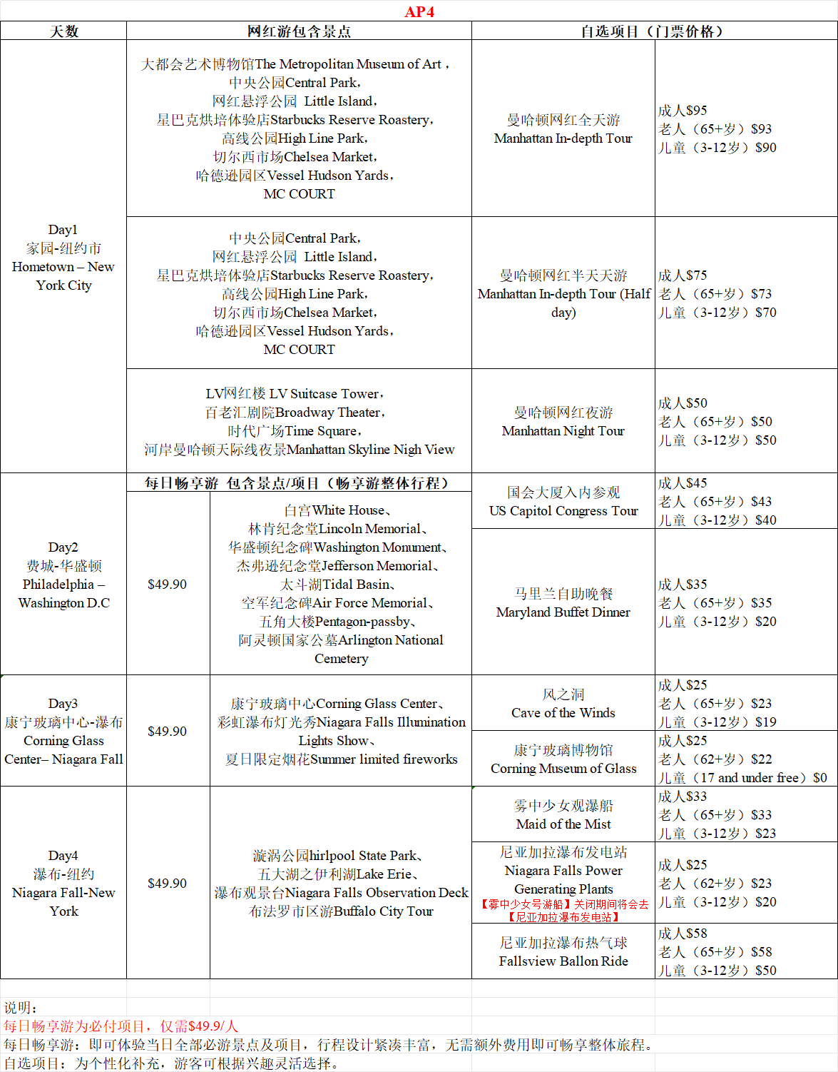 请选择BUF 1:30PM后航班;如跟车回纽约或波士顿需支付$75/人,有导游陪同