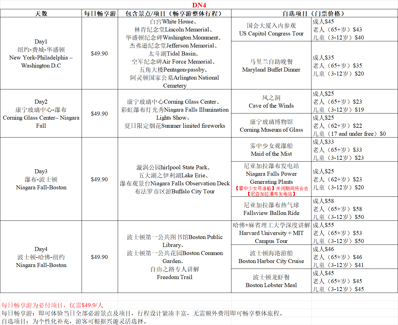 - 如遇景点临时关闭或节假日(感恩节、圣诞节、新年)关闭等,导致无法参观,导游会根据实际情况调整为外观或以其他景点代替以确保行程的丰富性。各景点及国家公园的开放时间及流量控制会因疫情不时变化,如影响行程属不可抗力因素,敬请谅解;If a sightseeing spot is temporarily closed or closed during holidays (such as Thanksgiving, Christmas, or New Year), and thus cannot be visited, the guide will adjust the itinerary based on the actual situation, either by visiting the spot from the outside or substituting with another attraction to ensure the richness of the trip. Opening hours and visitor flow control for attractions and national parks may change due to the pandemic. If it affects the itinerary, it is considered a force majeure, and we kindly ask for your understanding.