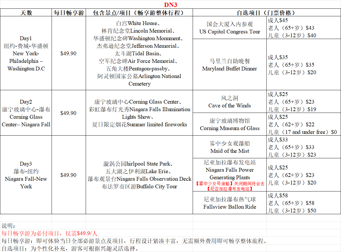 - 如遇景点临时关闭或节假日(感恩节、圣诞节、新年)关闭等,导致无法参观,导游会根据实际情况调整为外观或以其他景点代替以确保行程的丰富性。各景点及国家公园的开放时间及流量控制会因疫情不时变化,如影响行程属不可抗力因素,敬请谅解;If a sightseeing spot is temporarily closed or closed during holidays (such as Thanksgiving, Christmas, or New Year), and thus cannot be visited, the guide will adjust the itinerary based on the actual situation, either by visiting the spot from the outside or substituting with another attraction to ensure the richness of the trip. Opening hours and visitor flow control for attractions and national parks may change due to the pandemic. If it affects the itinerary, it is considered a force majeure, and we kindly ask for your understanding.
